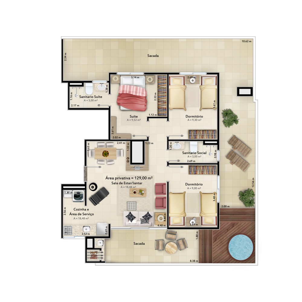 - Coberturas de 3 Dormitórios (sendo um suíte), com amplo e agradável terraço 180° com piscina e churrasqueira;