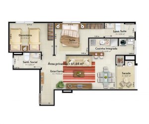 - Apartamentos de 2 Dormitórios (sendo um suíte), com agradável sacada com churrasqueira;